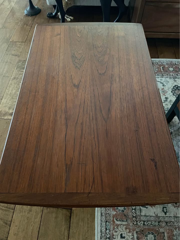 The piece has been carefully restored with a hand-rubbed teak oil finish that revives the warm grain while preserving its original Danish craftsmanship. Light age marks on the top consistent with vintage teak — preserved to maintain its authentic mid-century character.