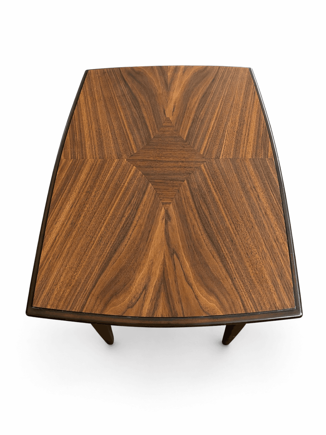 Mid century modern walnut side table made by Kaufman, featuring a rich finish and a beautifully detailed geometric veneer top.