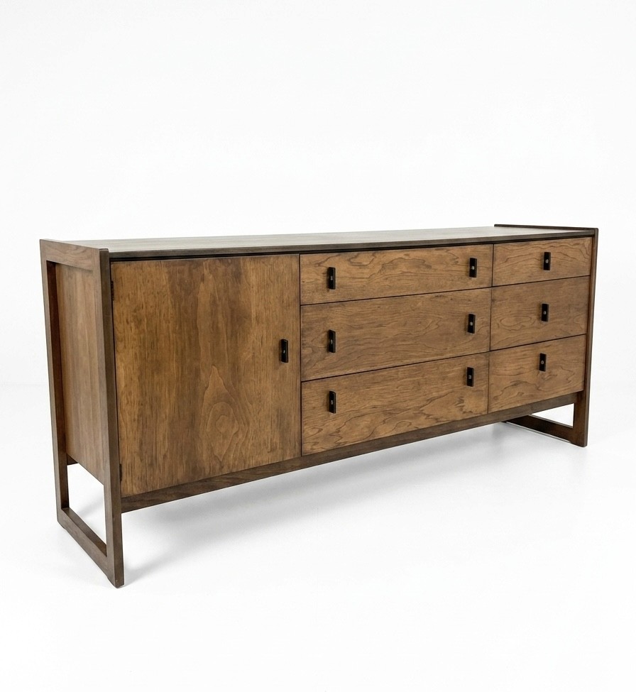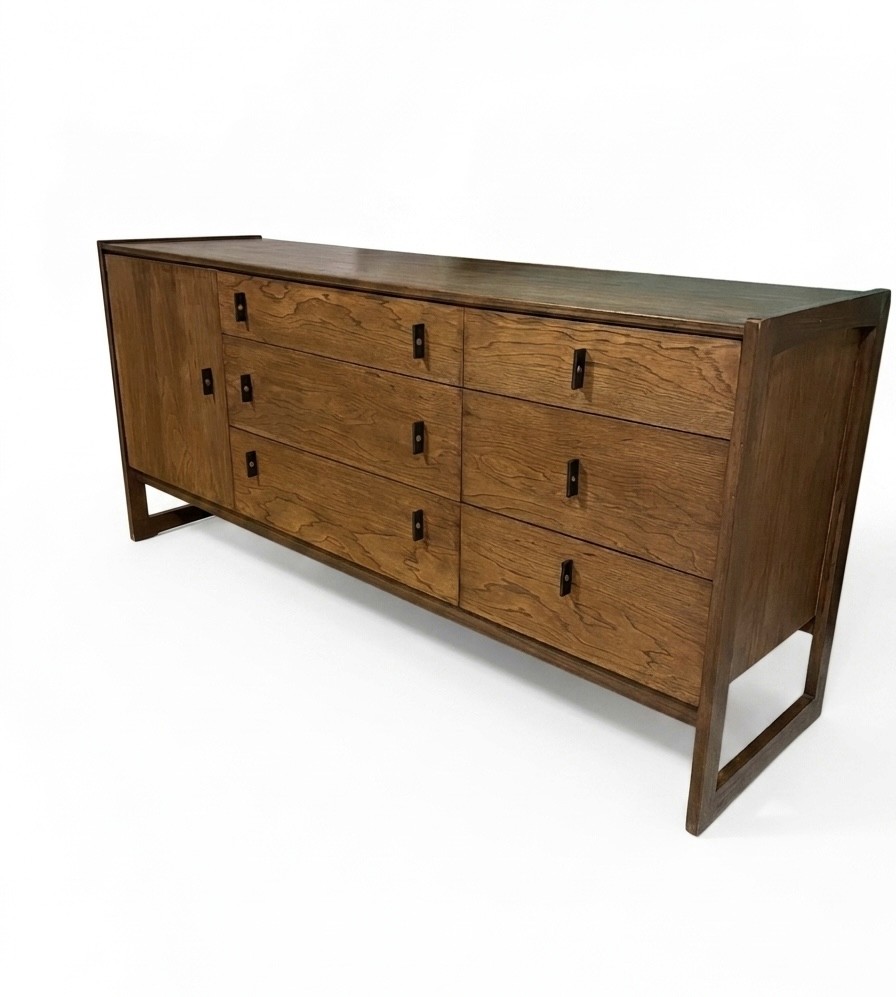 A beautifully refinished mid-century modern Kaufman in black walnut, blending clean architectural lines with highly functional storage. With its long, architectural silhouette and recessed "floating" base, it bridges the gap between a bedroom dresser and a sideboard or media console.