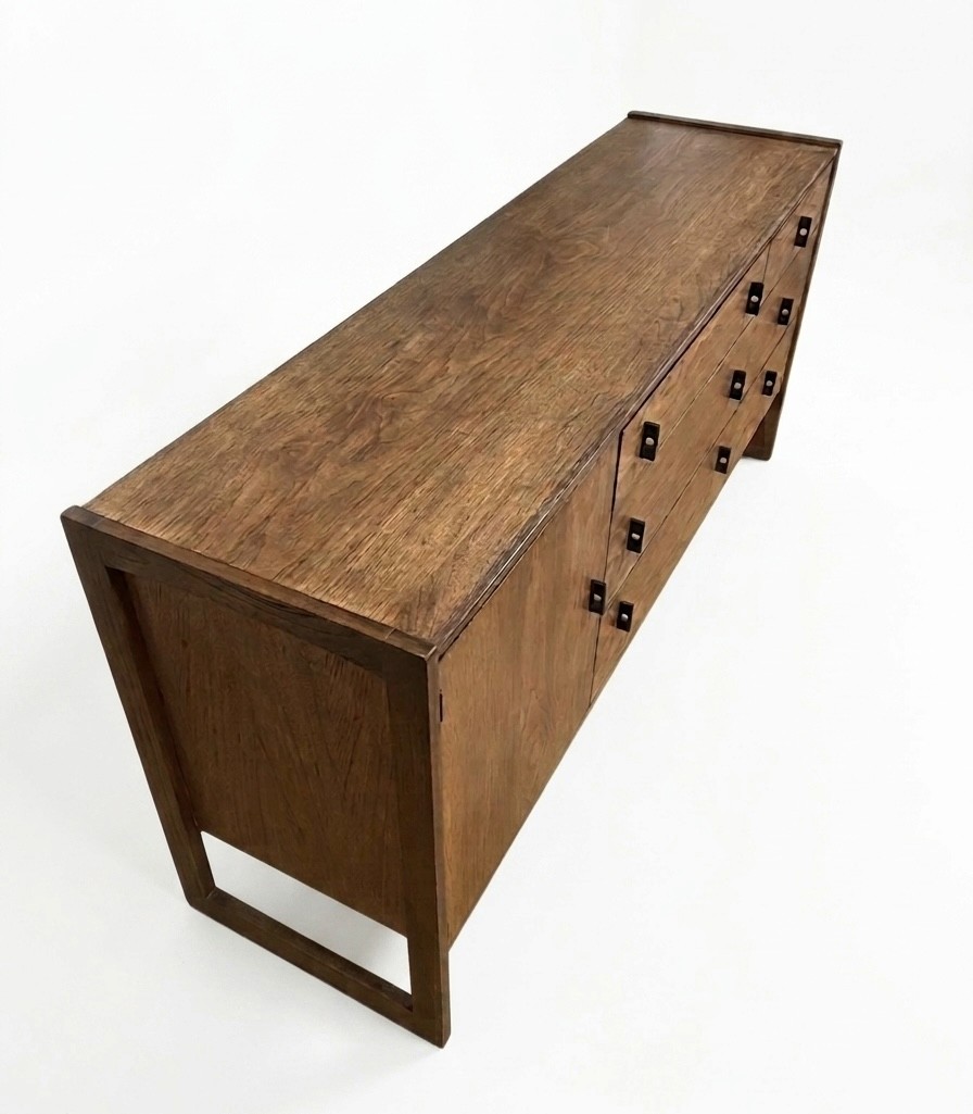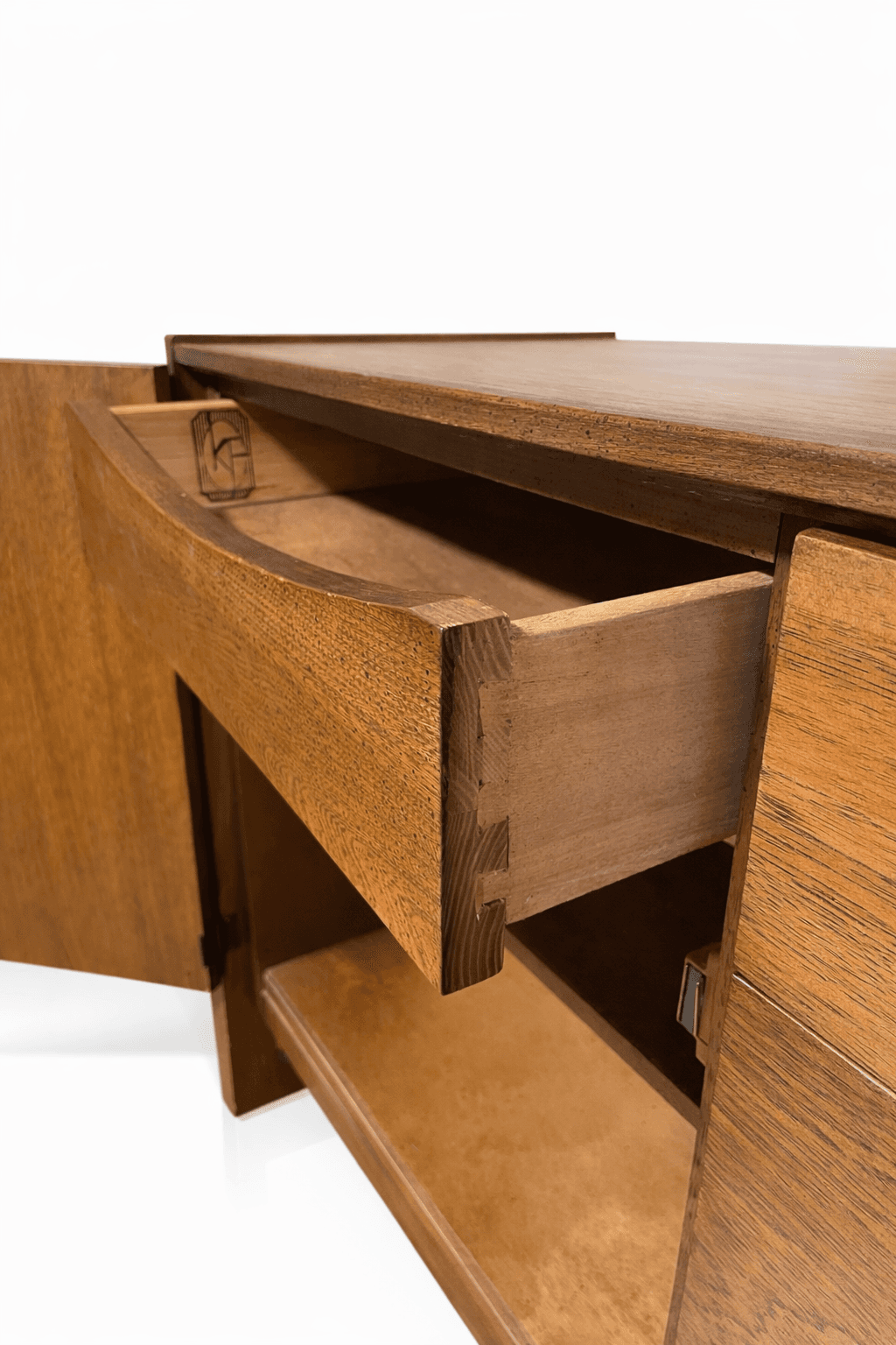 Fully refinished to highlight the natural richness and grain of the walnut, with a warm, even tone and a soft satin finish. The original metal pulls provide a subtle contrast against the walnut, while the open leg base gives the piece a light, elevated presence.