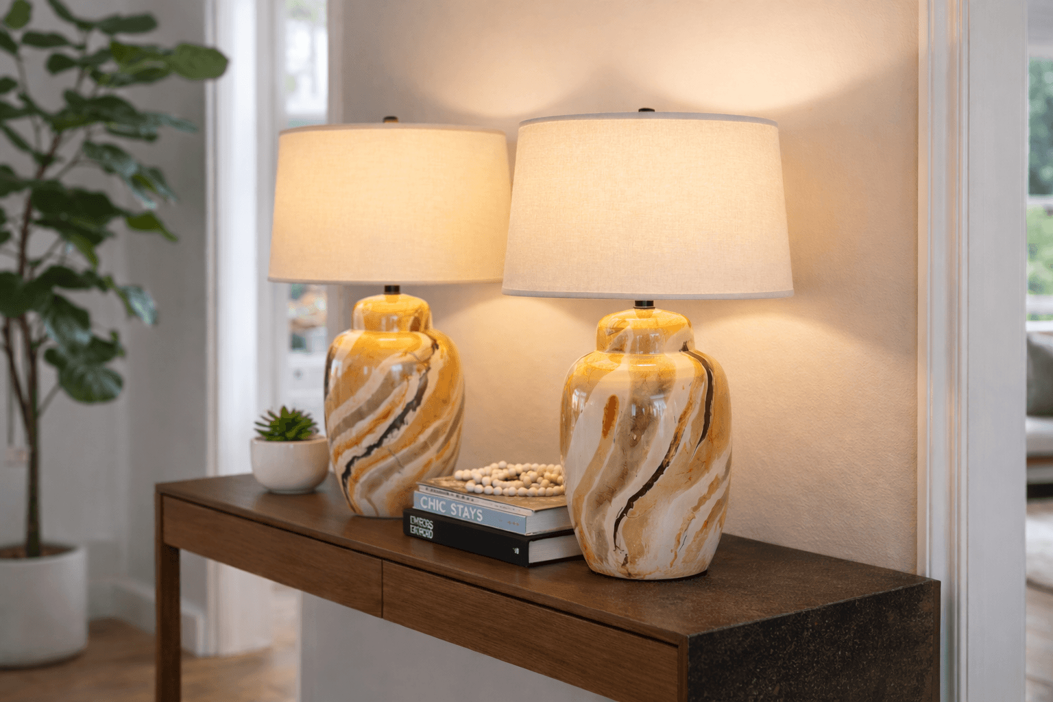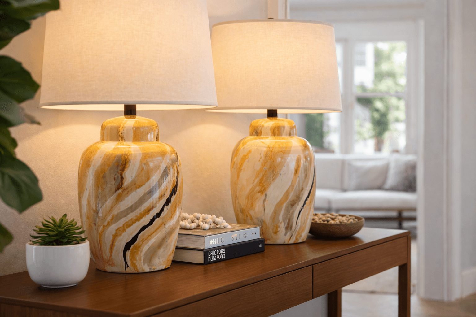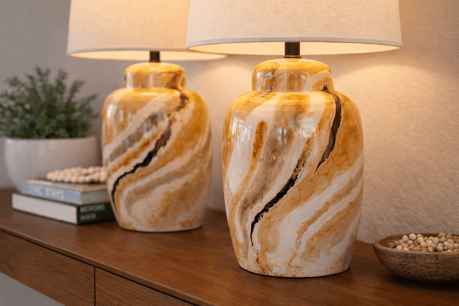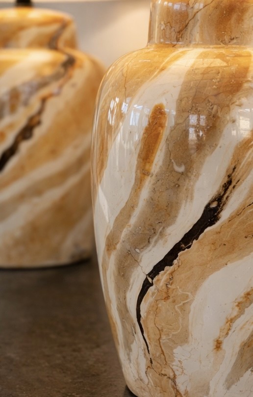 Paired with oversized ivory linen drum shades, these lamps strike an ideal balance between warmth and architectural presence. The darker tones in the glaze ground the pieces visually, while the lighter marbling catches and reflects light beautifully when illuminated, creating a soft, even glow.