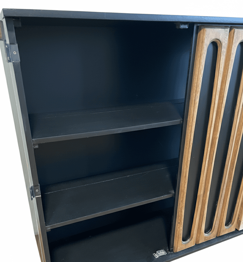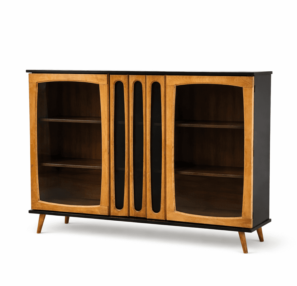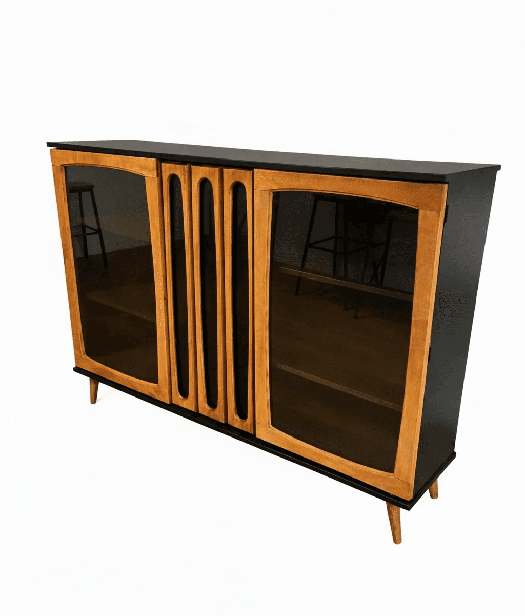 A versatile MCM piece that blends original character with a modern update, featuring solid wood framed glass doors and sculptural centre panels.