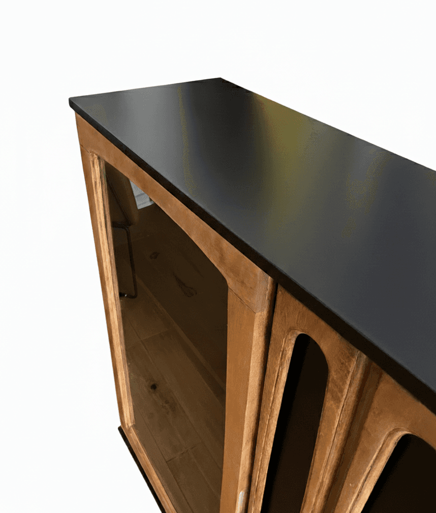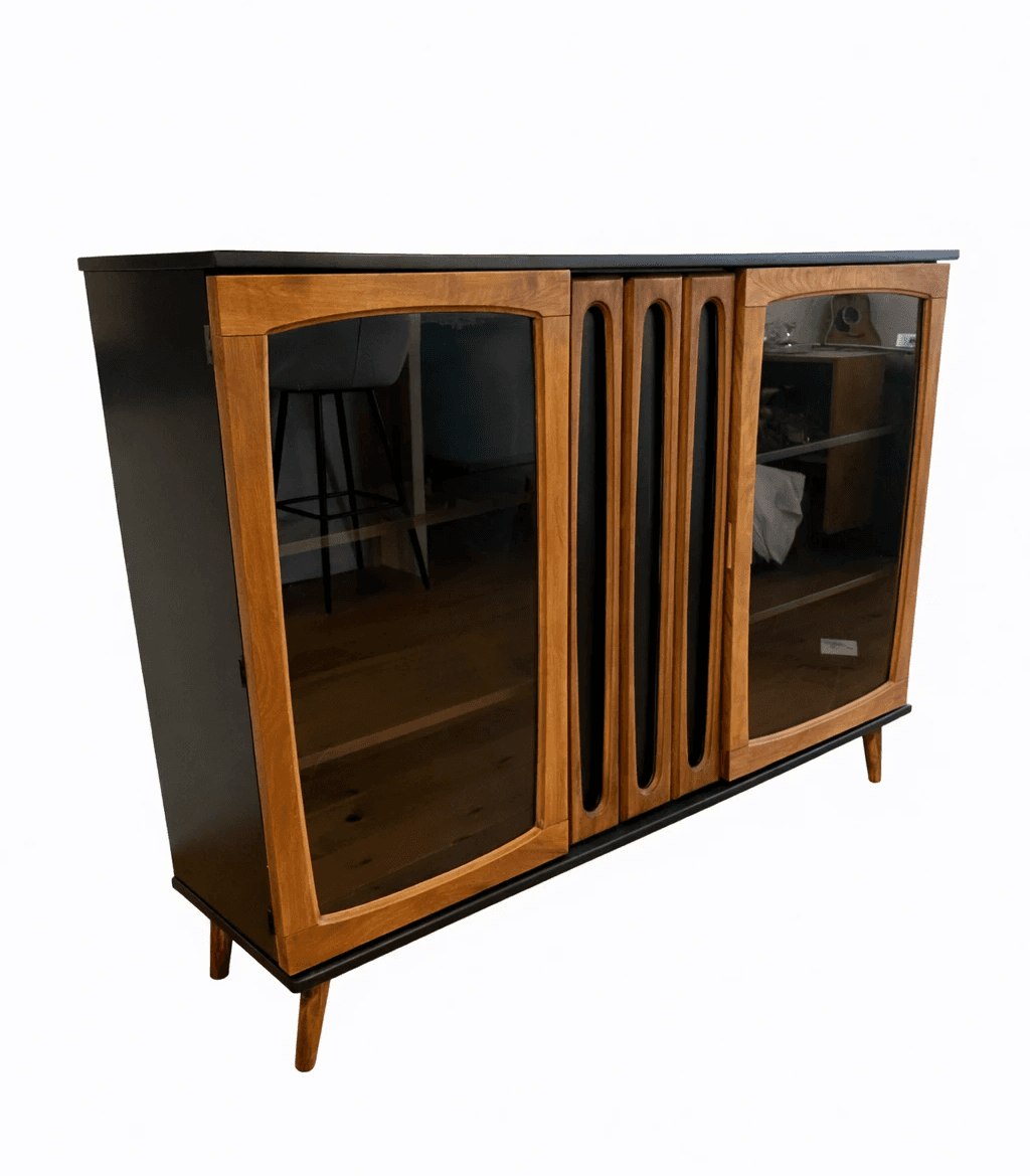 The body has been refinished in Sherwin-Williams Tricorn Black, creating strong contrast against the warmth of the original wood doors and centre detailing. The glass panels keep contents visible while maintaining a clean, structured look.