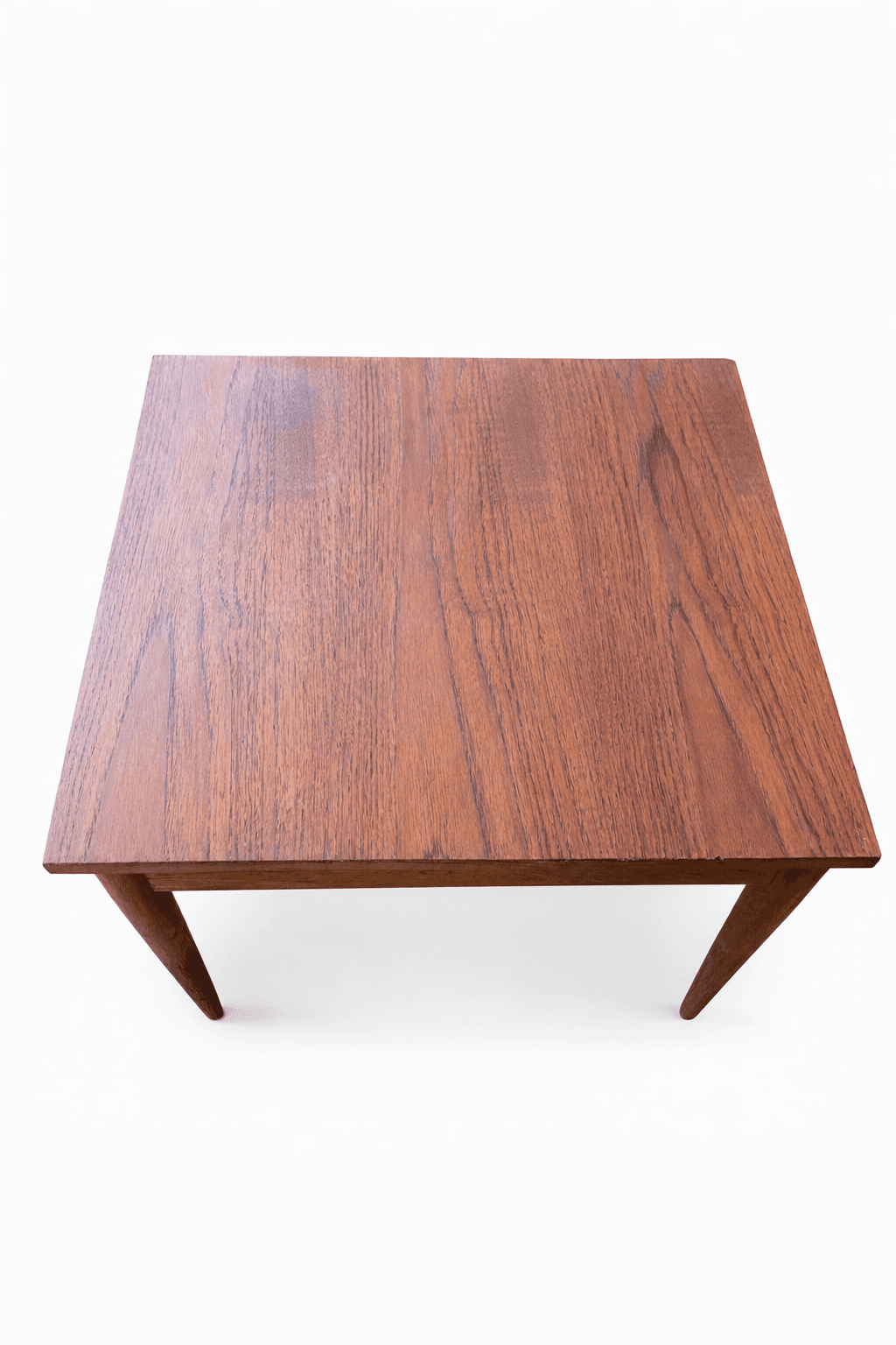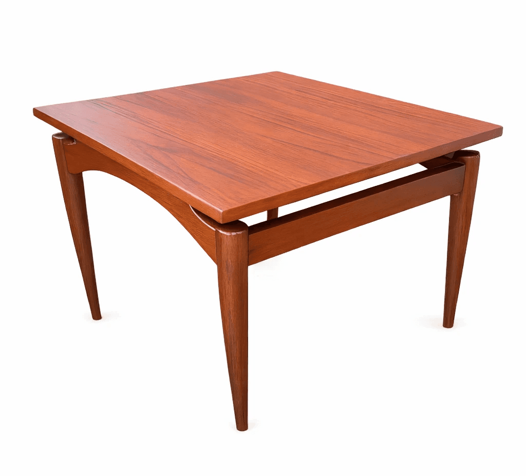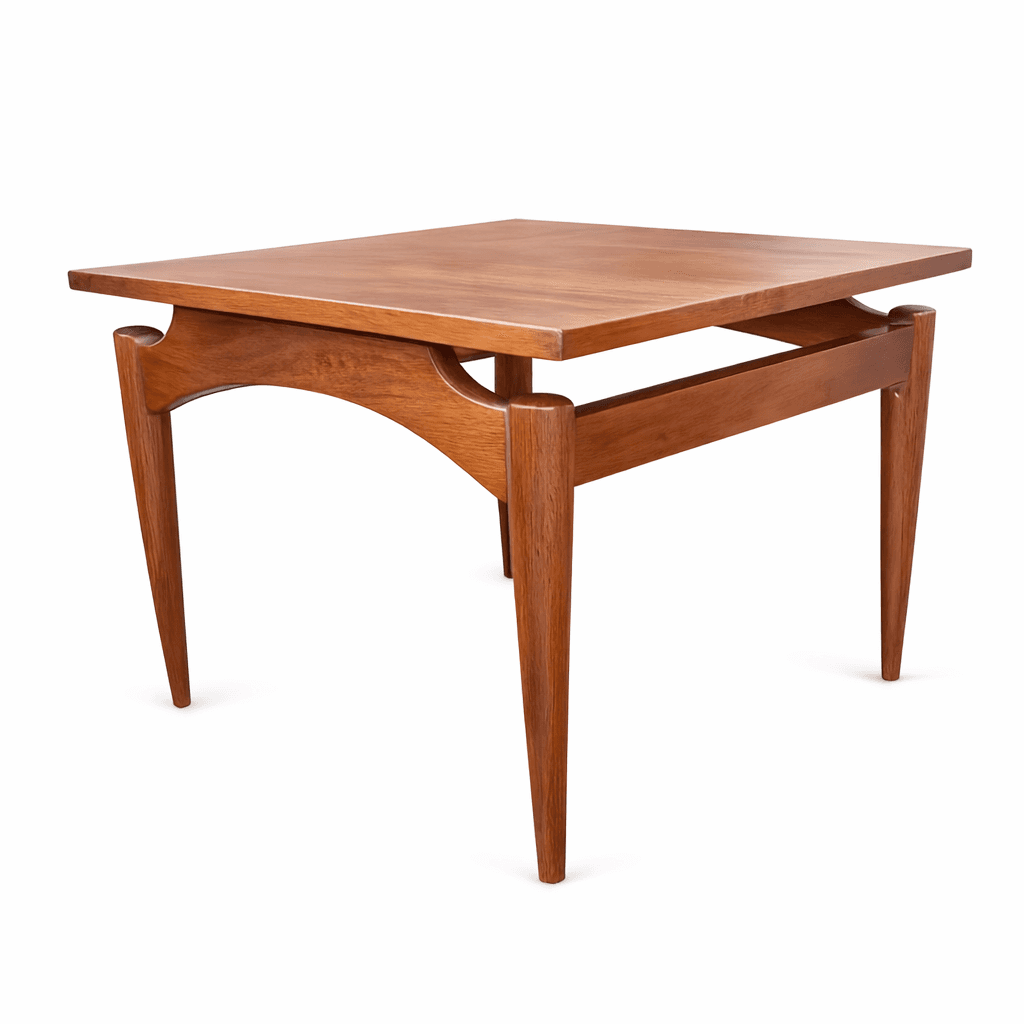 A compact mid-century teak side table featuring arched stretcher detailing and tapered legs. The curved apron and light profile reflect the Danish-influenced design language that defined much of the era’s furniture. Its small footprint makes it an easy accent piece beside a lounge chair or sofa while still carrying strong mid-century lines.