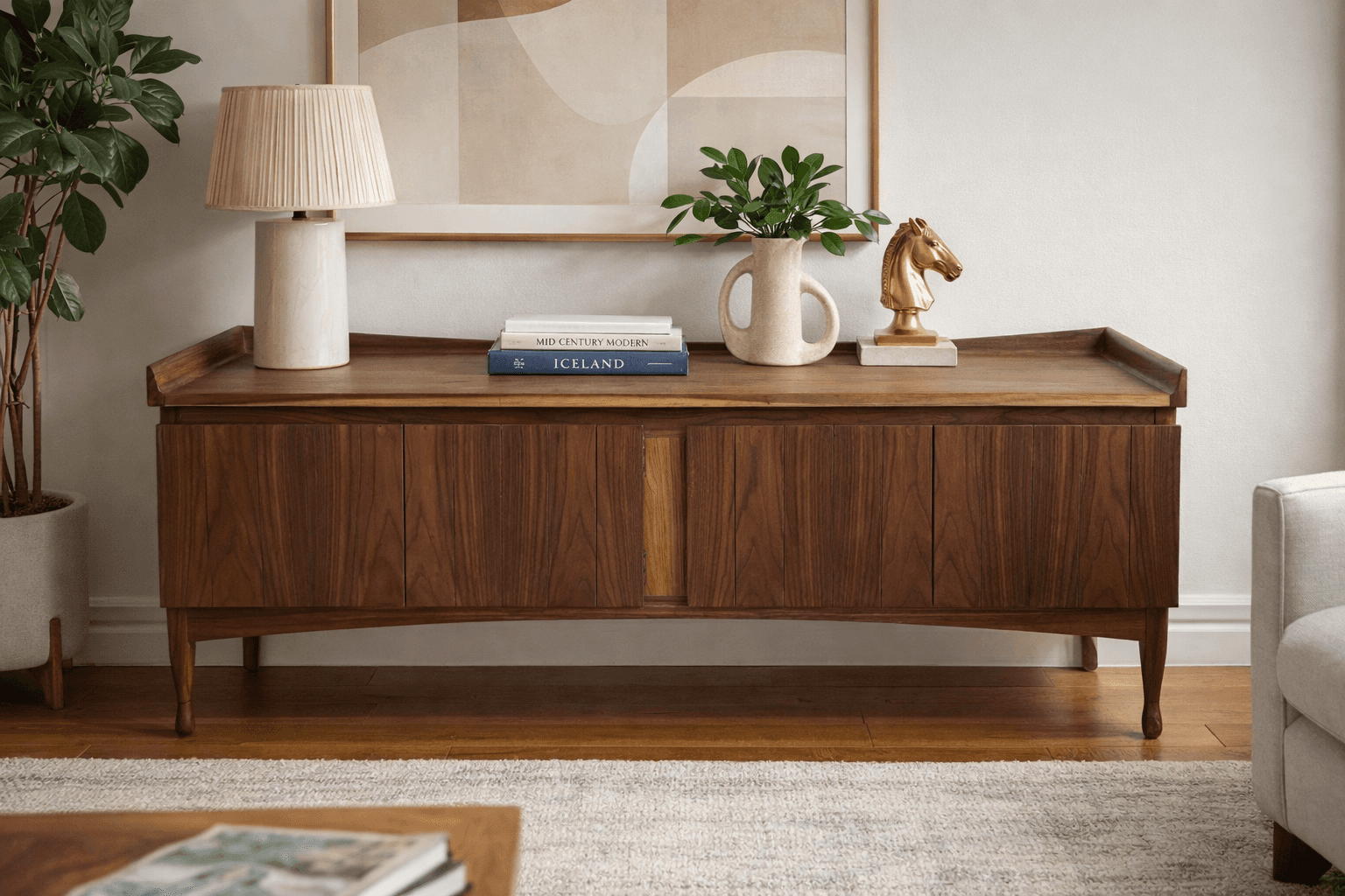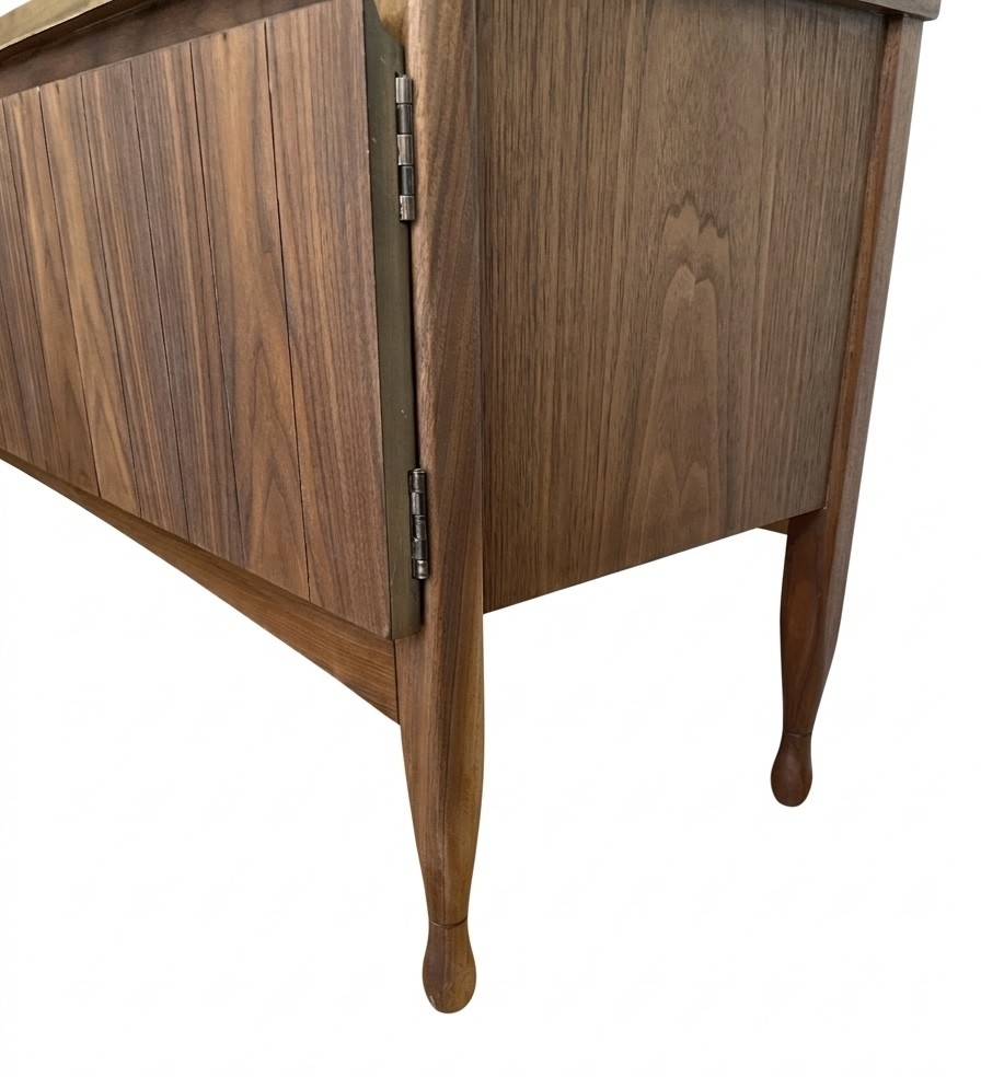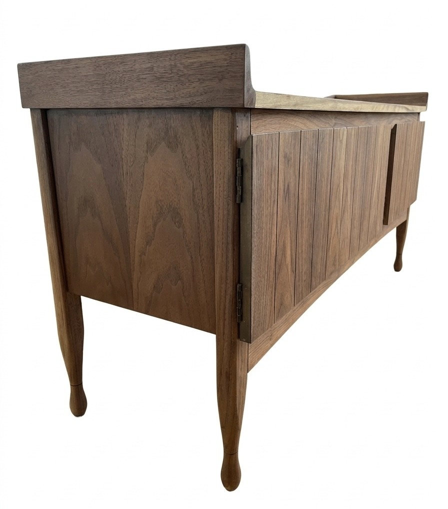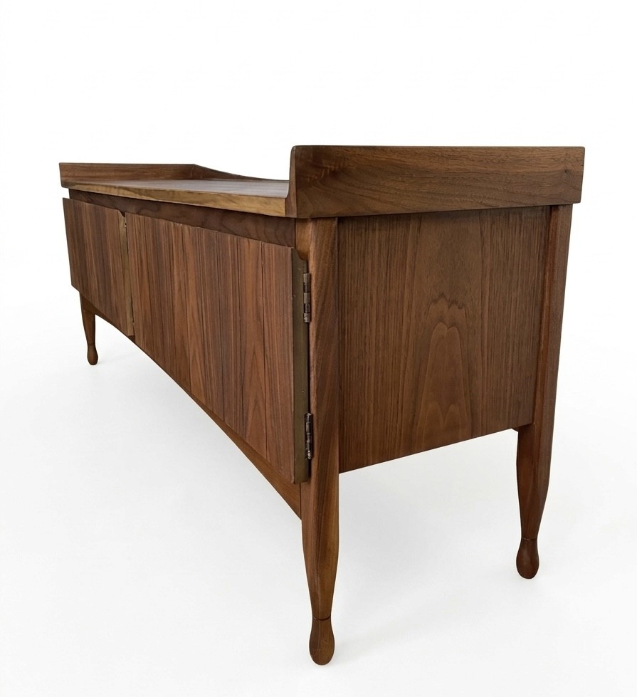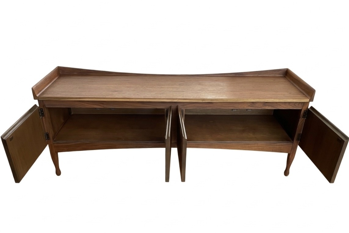A beautifully restored mid-century modern walnut console with exceptional grain and a refined, low-profile silhouette.