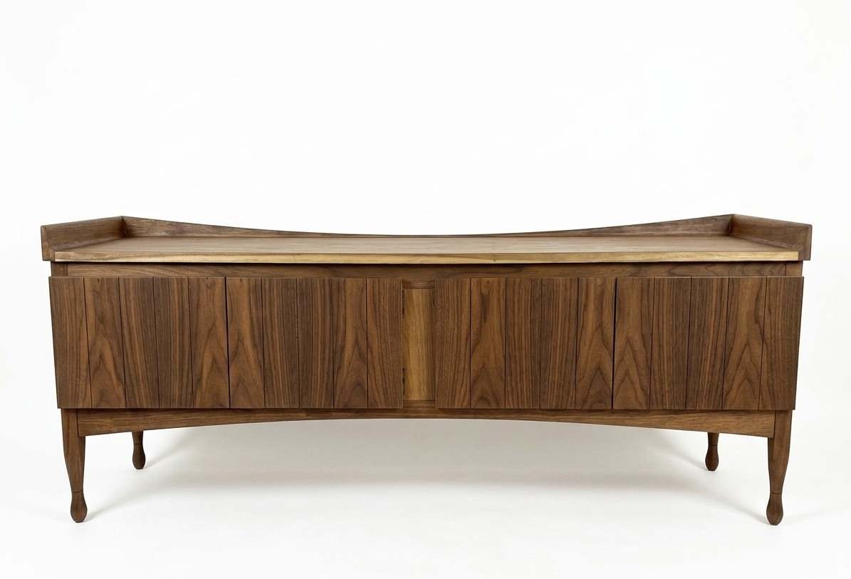This piece features four solid wood doors that open to a spacious interior, offering generous concealed storage while maintaining a clean, uninterrupted front. The subtle curve along the base, tapered legs, and sculpted top edge create a balanced, architectural presence.