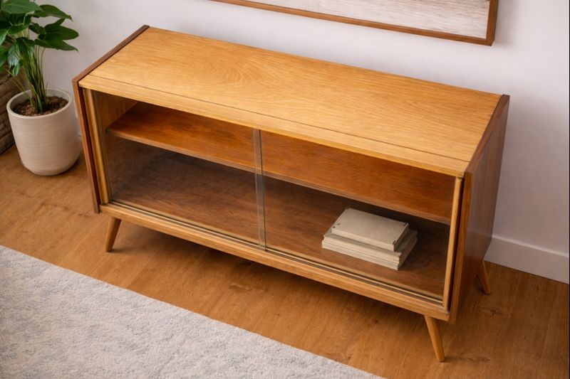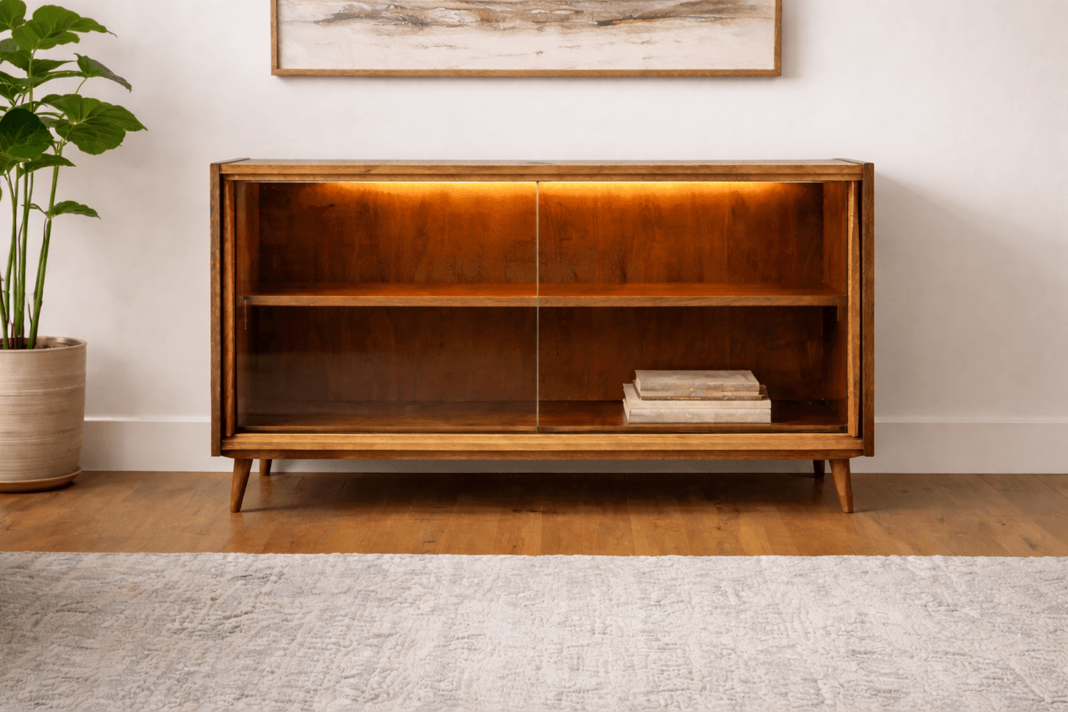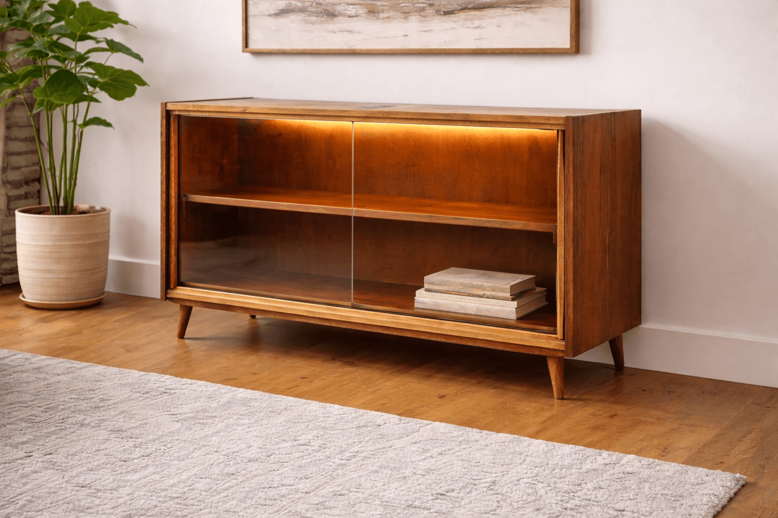 A clean, well-proportioned mid-century modern walnut cabinet with sliding glass doors and integrated warm interior lighting. The compact scale and low profile make it especially versatile — ideal as a bookshelf, display cabinet, or bar cabinet.