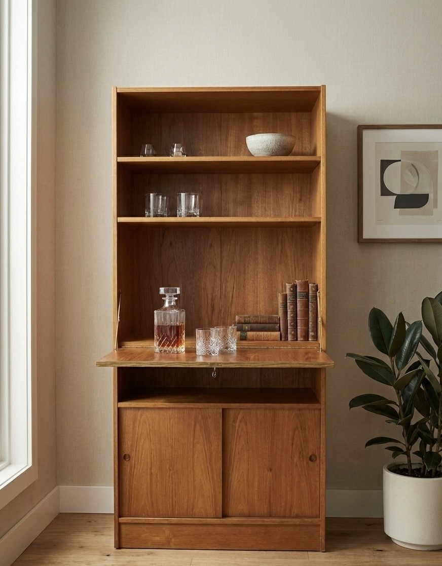 This vintage mid-century teak secretary combines warm materiality, thoughtful function, and a compact footprint – making it an ideal piece for both modern living and classic interiors.