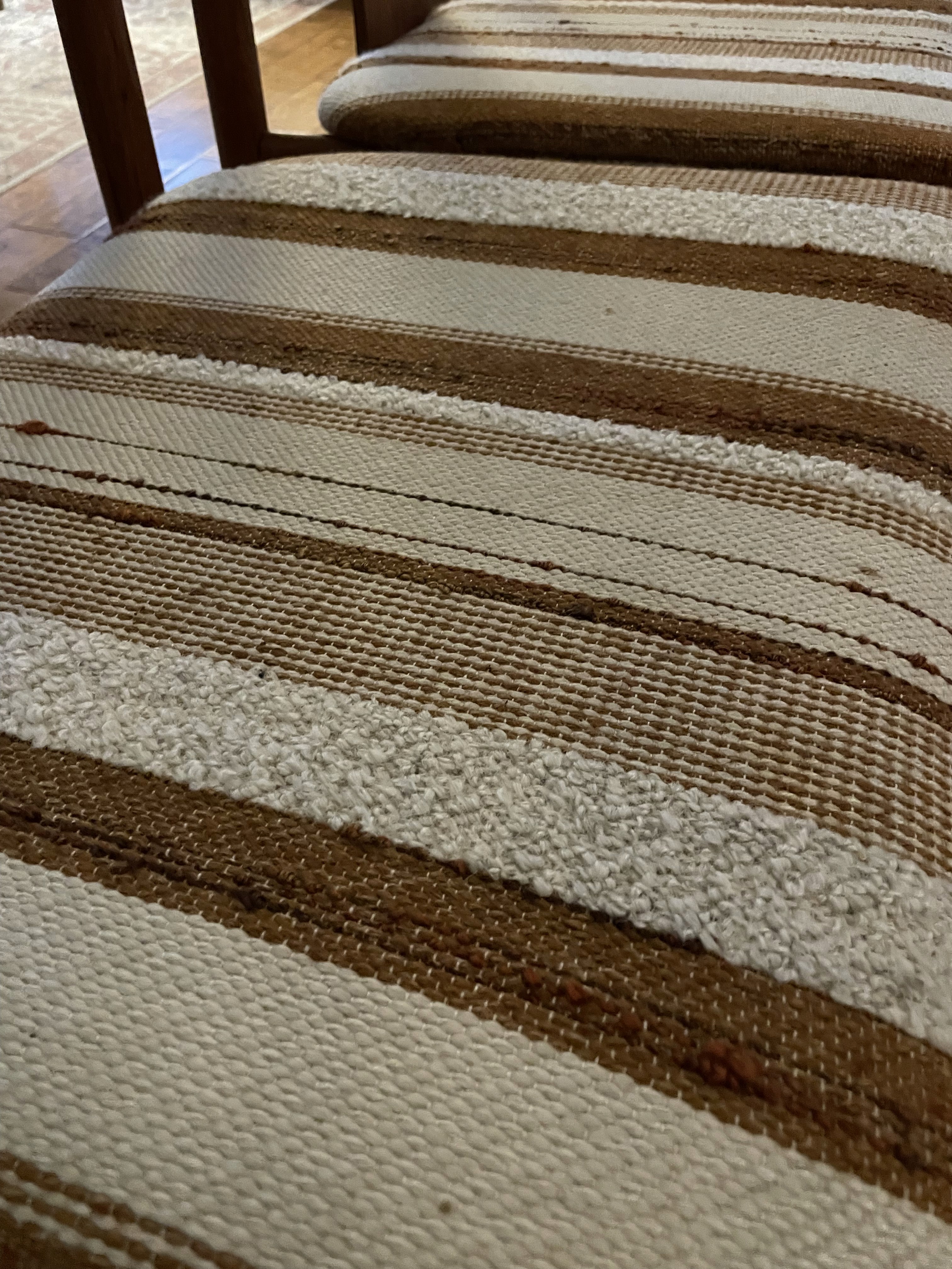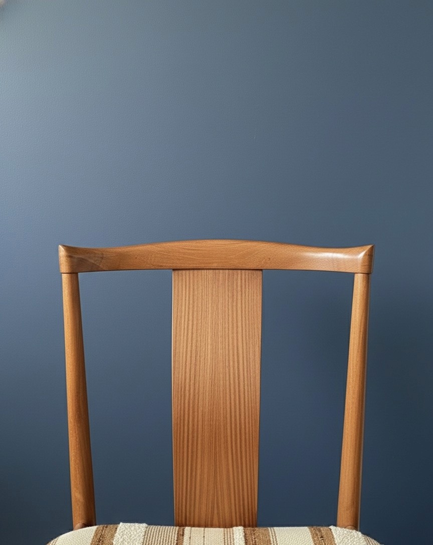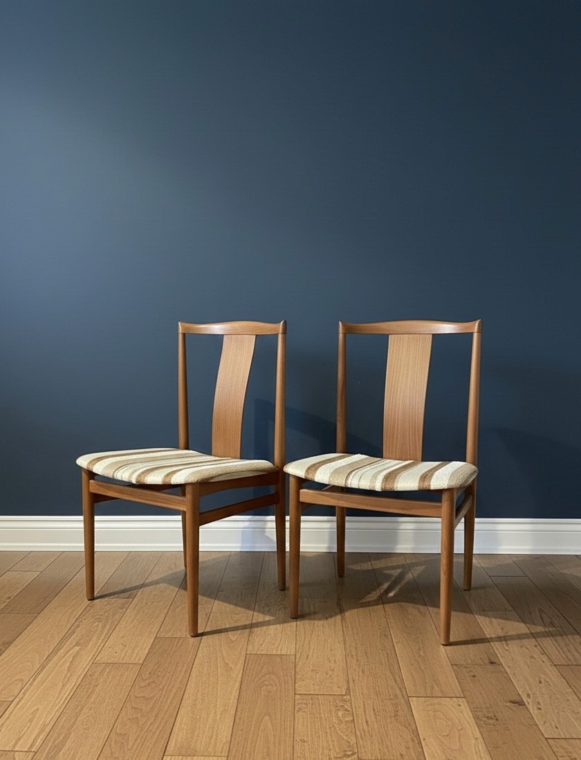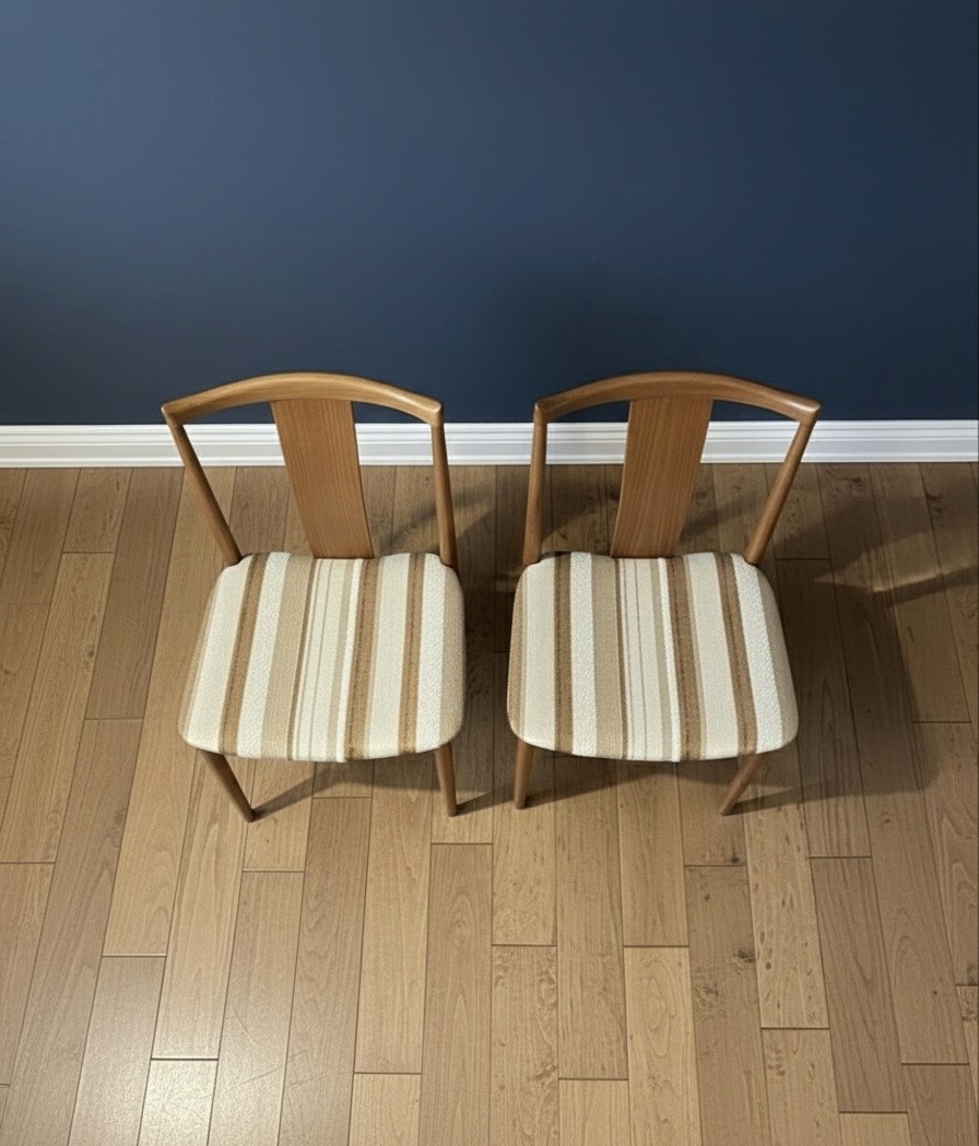 Their form is timeless. The teak has a soft, natural sheen, and the striped upholstery adds a warm, textural note that pairs effortlessly with both modern and vintage spaces. Styled as a pair, they make a striking accent in a dining nook, bedroom, or entryway vignette.