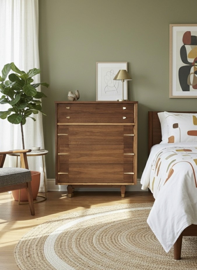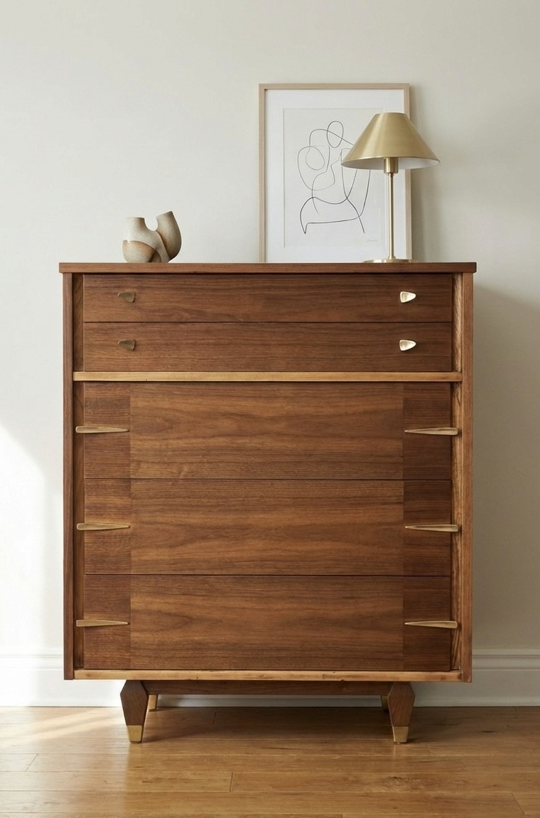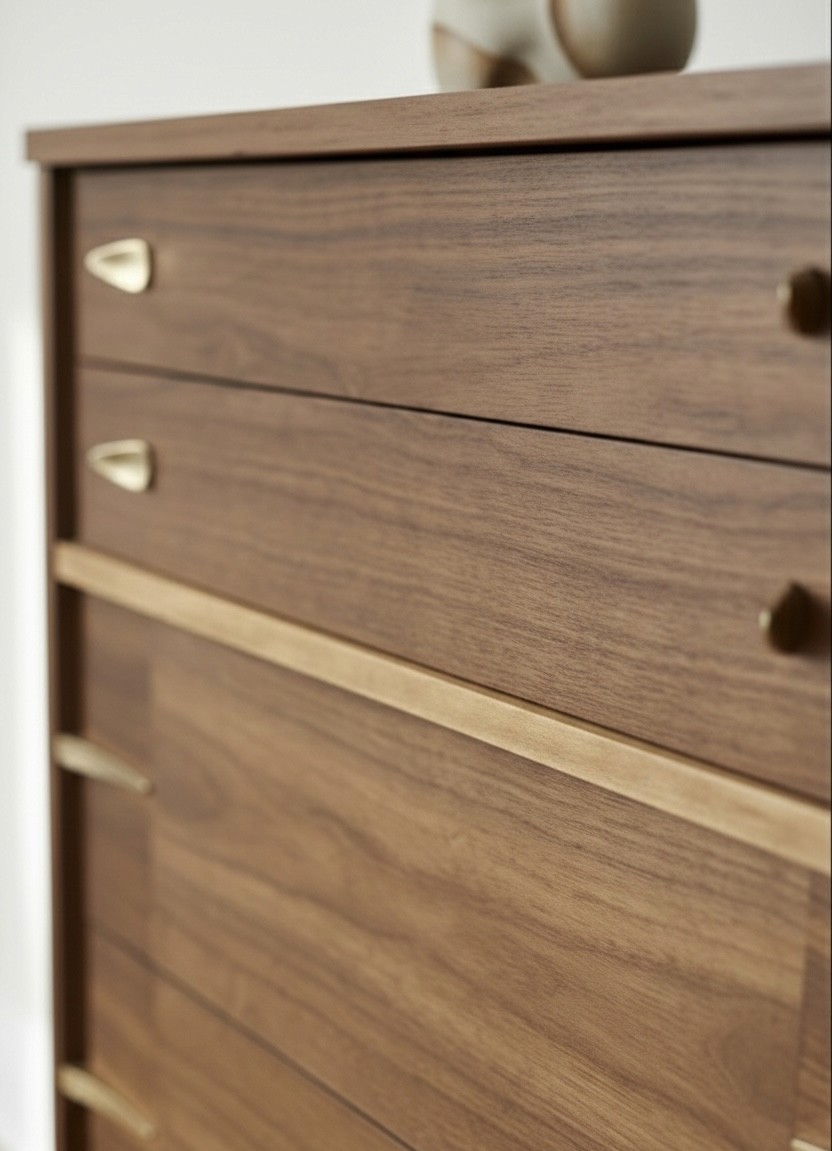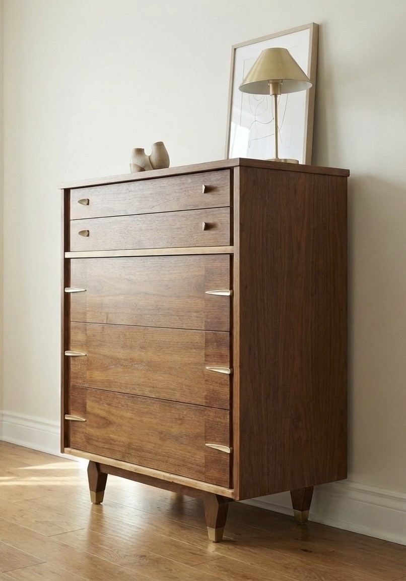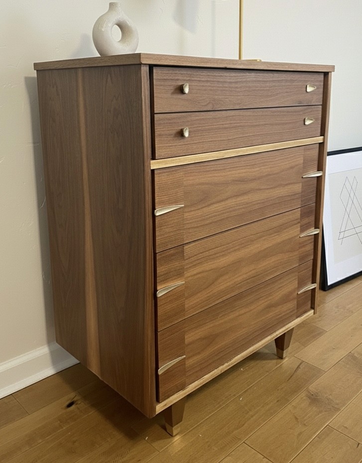 A beautifully restored Canadian mid-century walnut tallboy by Strathroy Furniture (c. 1960). Subtle architectural details — like the framed end strips on the three lower drawers — give this piece a clean, tailored look that feels both classic and modern. Compact in width but impressively deep, this piece offers substantial storage without overwhelming a room.
