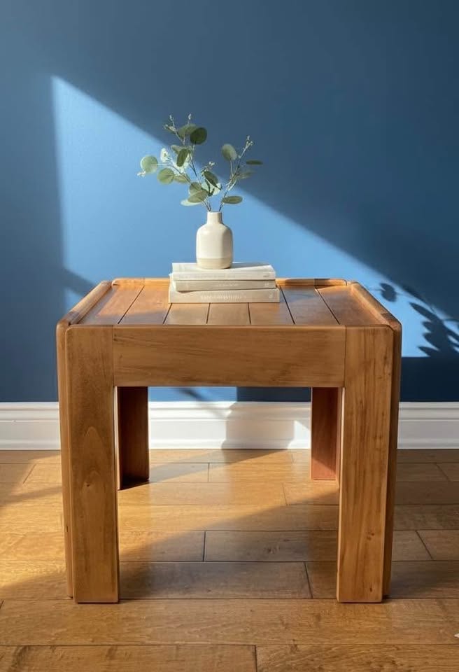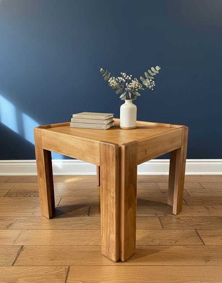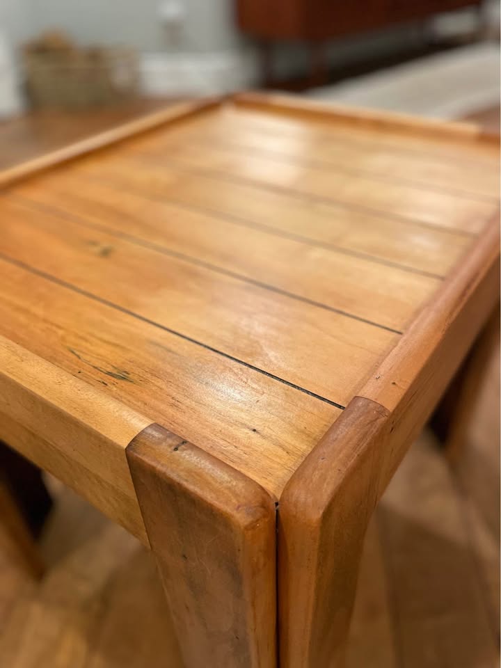 This rare Kroehler design is a true standout — a sculpted solid-wood side table that blends mid-century lines with warm, modern-rustic character. The chunky plank top, rounded edges, and block legs give it an architectural presence that feels custom-crafted, not mass-produced.