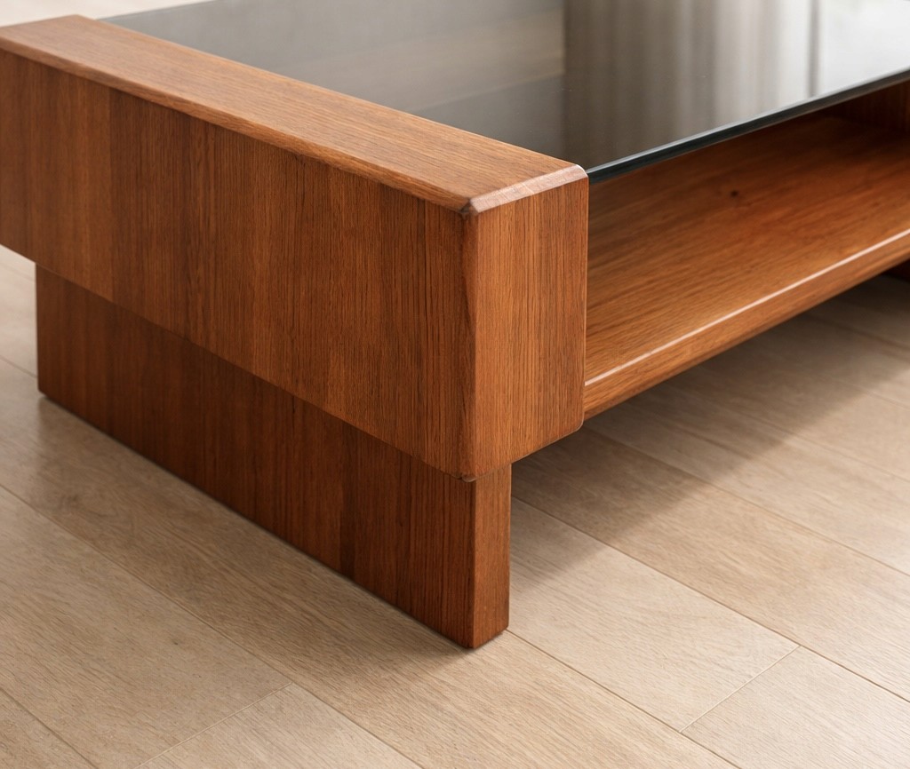 A small area of veneer wear on the bottom side of the coffee table has been mitigated; it does not affect structure, stability, or visible presentation