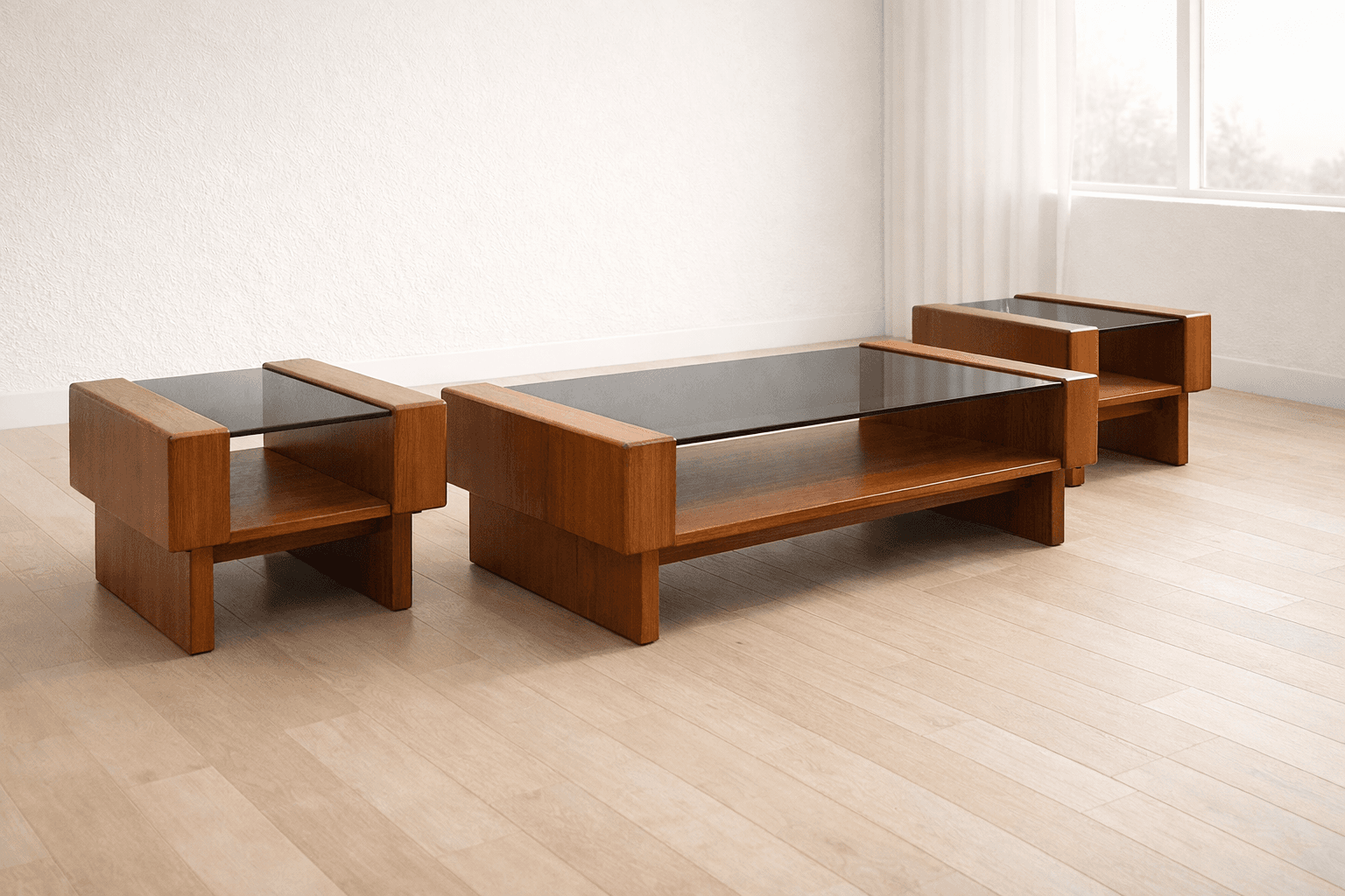 This cohesive three-piece set includes one long coffee table and two matching end tables, all uniform in height — a detail that speaks to intentional design and makes complete sets like this increasingly difficult to find. Crafted in richly grained teak with original smoked glass tops, the silhouette is low, grounded, and quietly commanding.