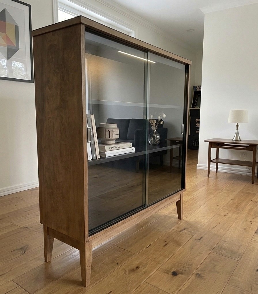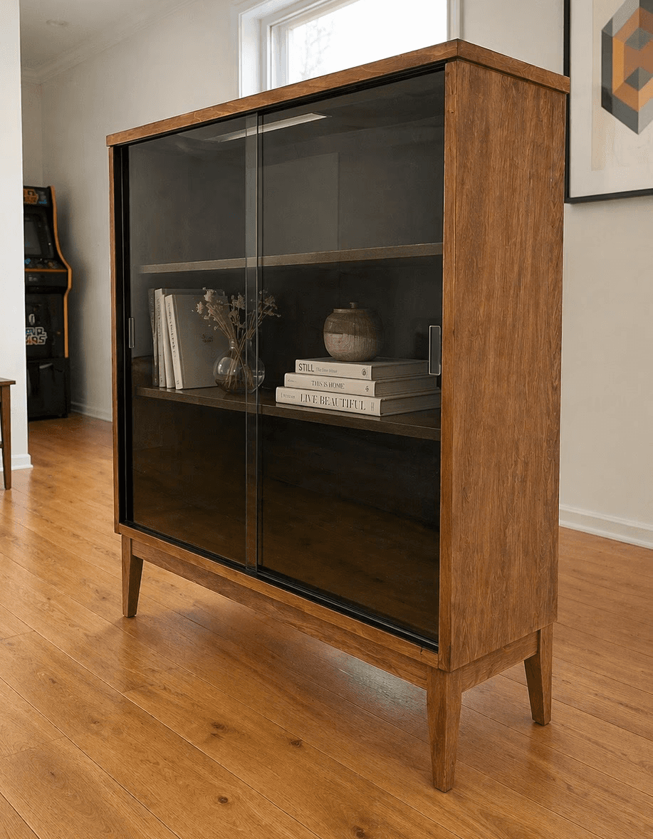 Features two adjustable shelves and smooth sliding glass doors. Top and shelves have been sealed for durability. A versatile piece that works equally well as a compact bar, display cabinet, or stylish storage.