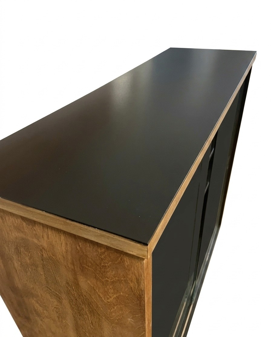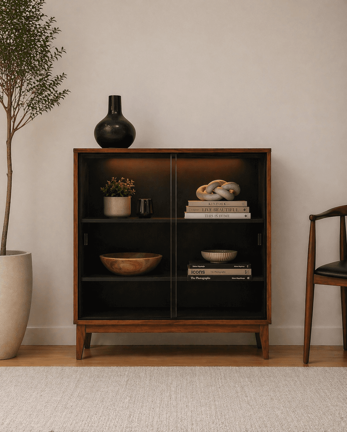 Walnut-stained wood with a satin black interior and top for contrast and depth. Clean, minimal form elevated with integrated, adjustable lighting creates a warm, ambient glow - perfect for barware, ceramics, or curated pieces.