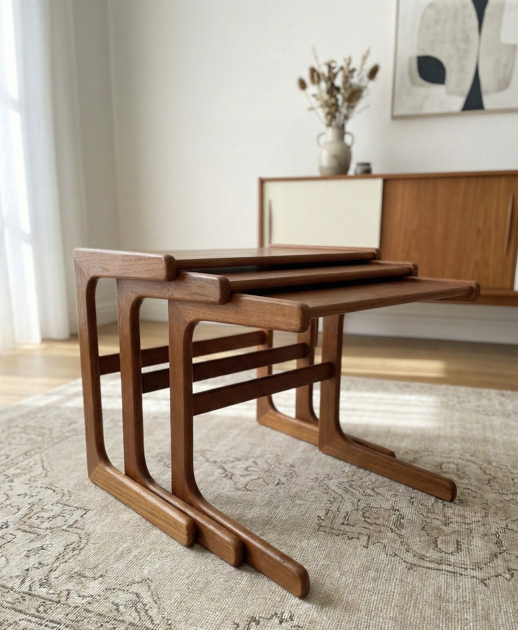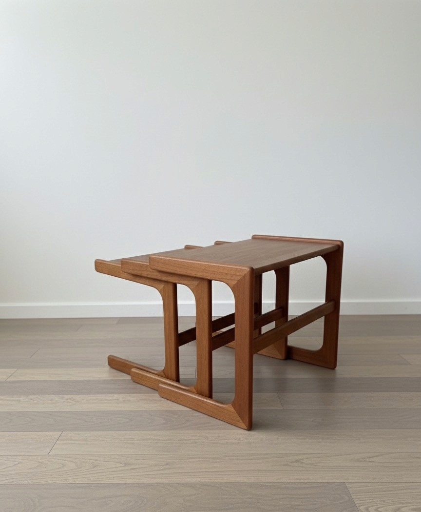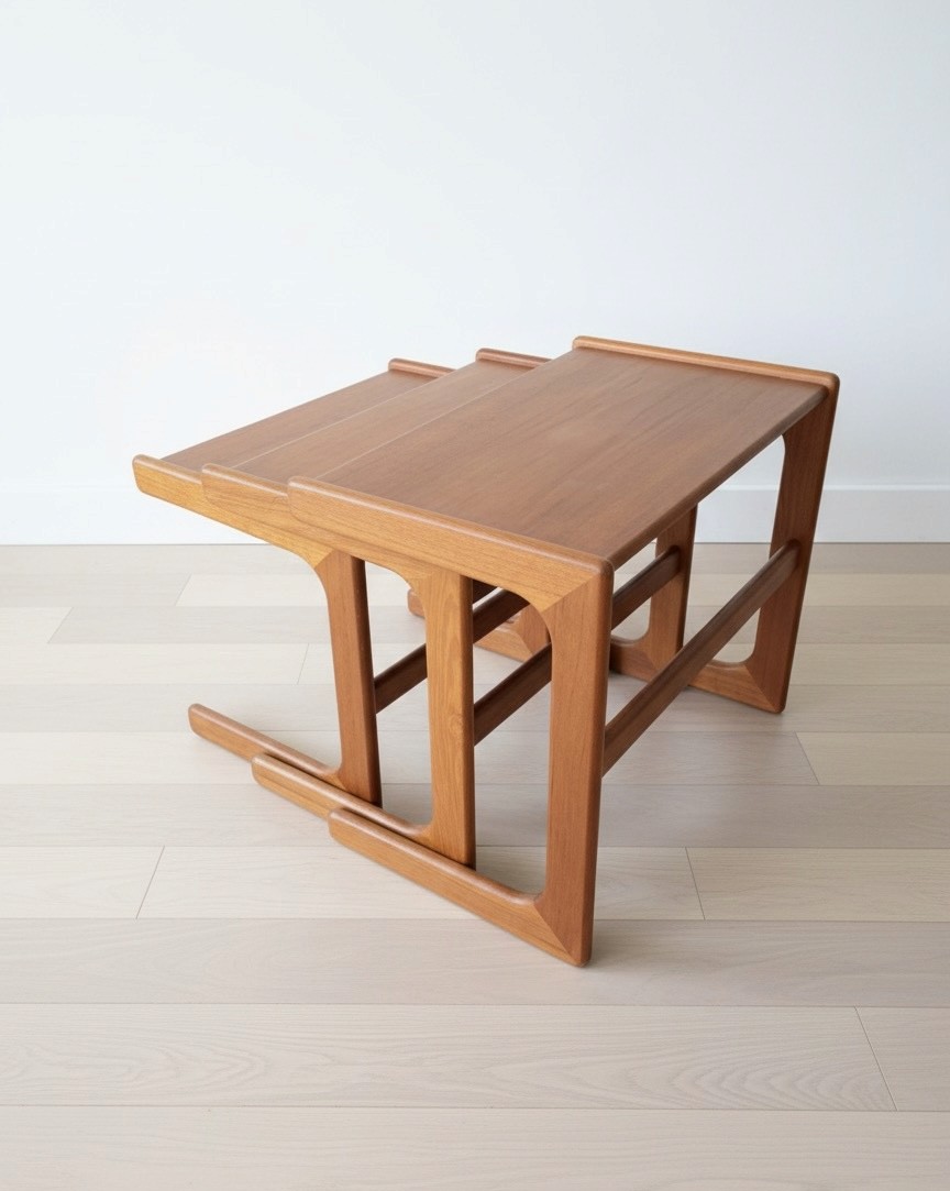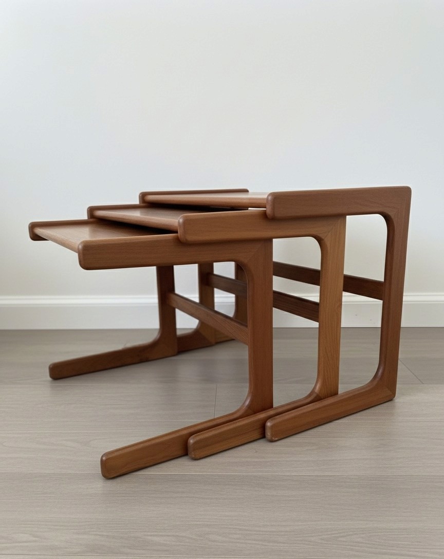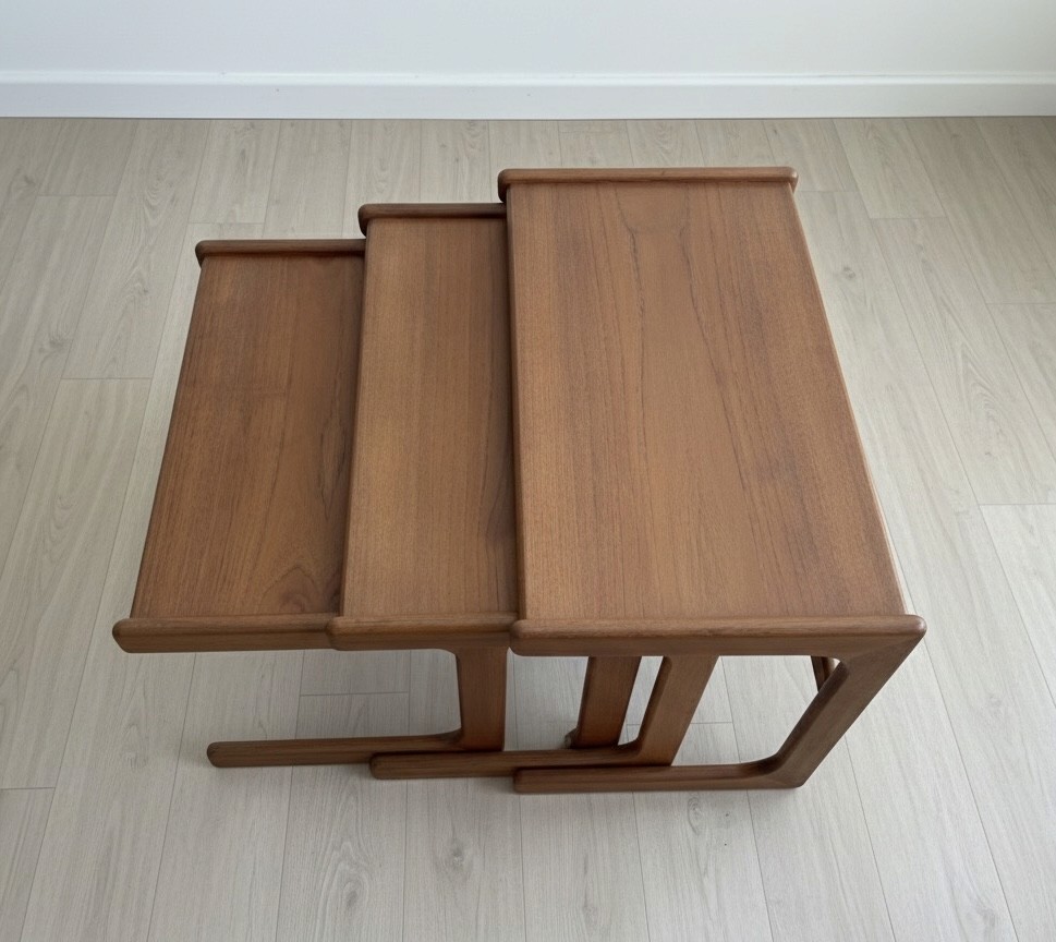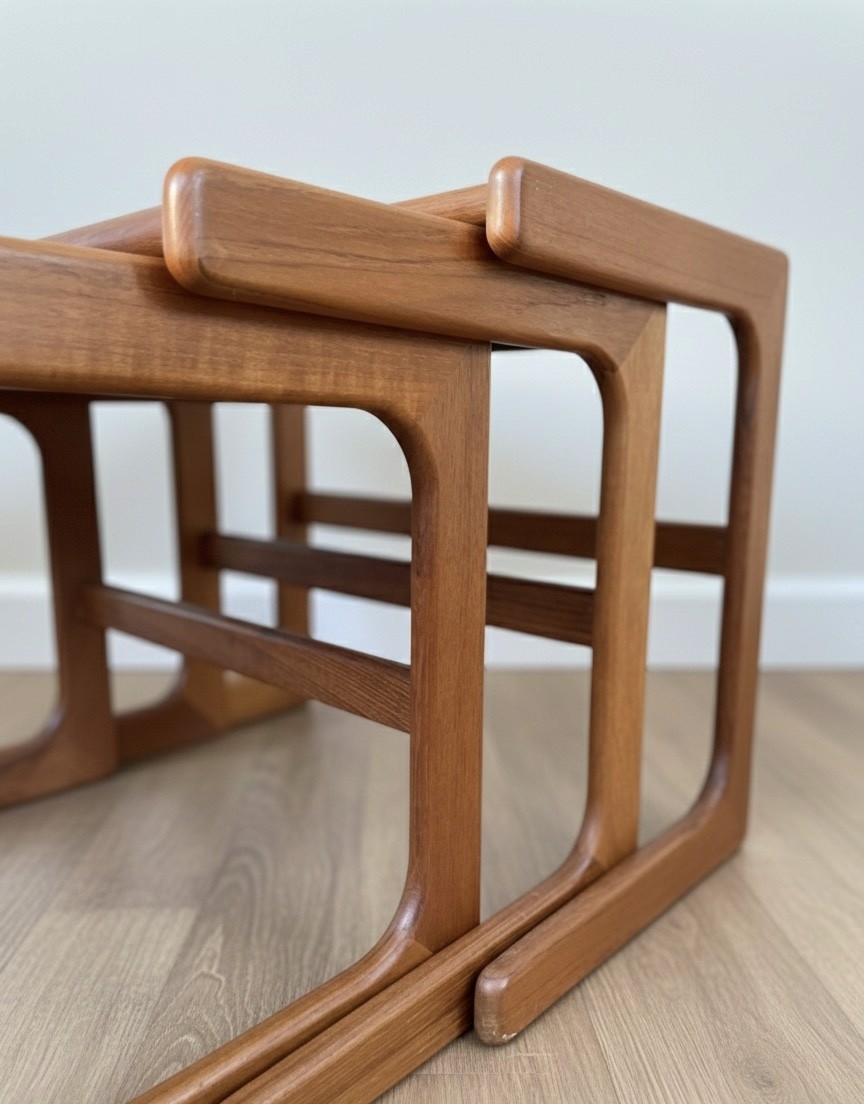 The solid teak frames have the iconic curved lower supports and rounded edges Nyborg is known for. Each table nestles smoothly beneath the next, offering versatility as side tables, coffee table extensions, or sculptural décor pieces.