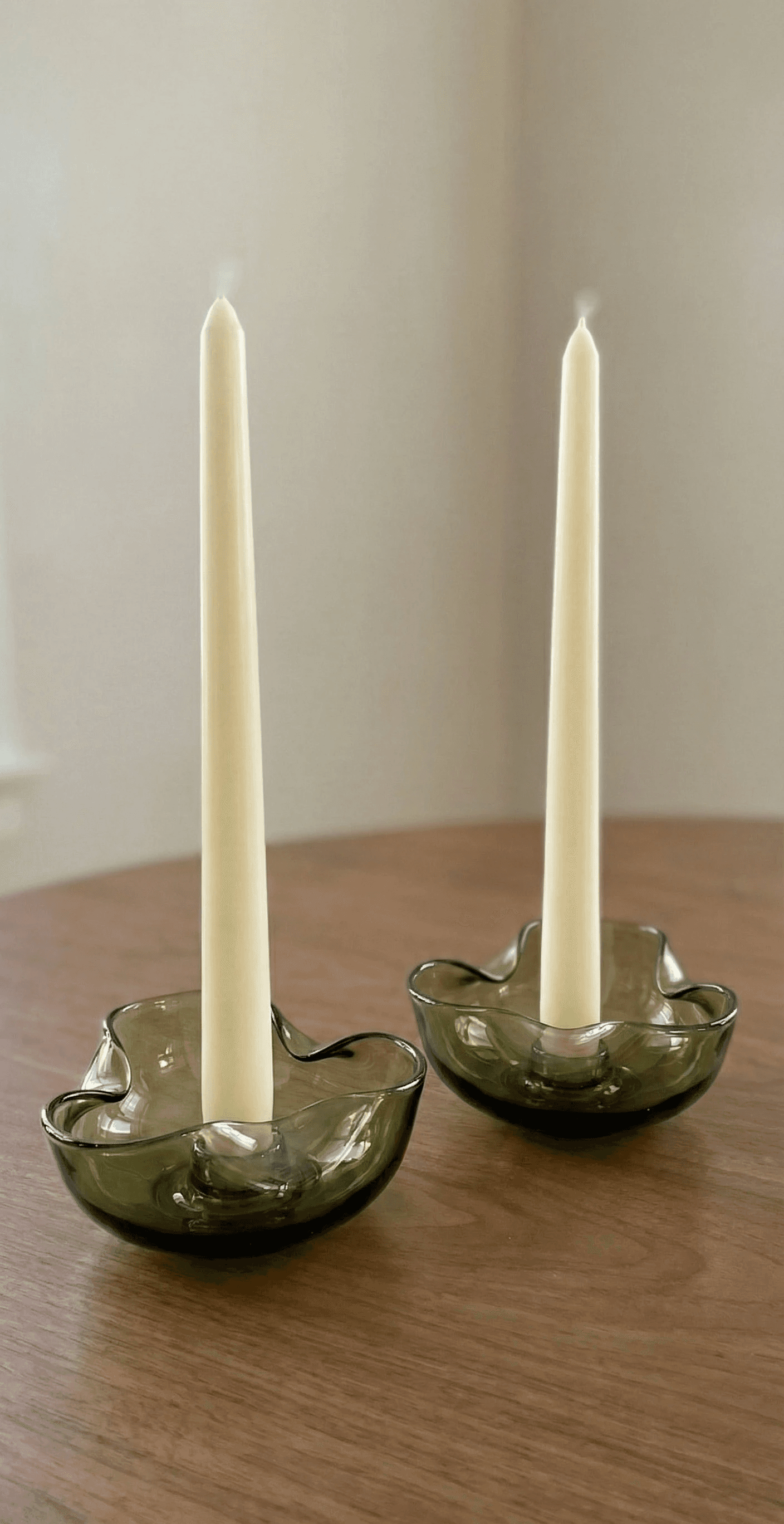 This curated vintage pair brings a quiet, mid-century sensibility — simple, elegant, and effortlessly expressive. Perfect on a dining table, console, or bedside for a subtle touch of light and shape.