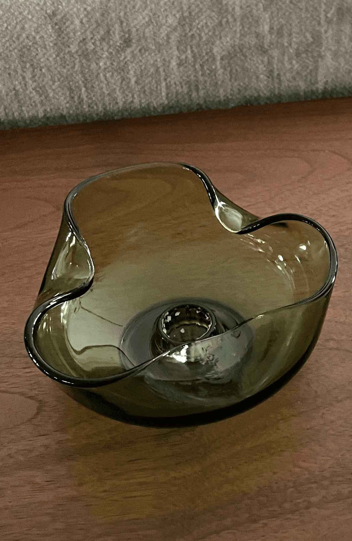 Soft sculpted edges, smoky olive glass, and a warm modern glow.